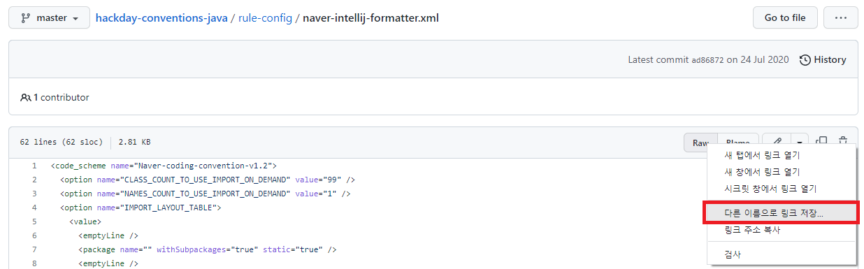 2. Raw버튼 위에서 마우스 우클릭하고 다른 이름으로 저장