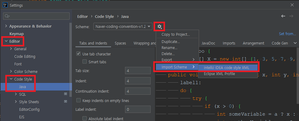 4. Editor ▶ Code Style ▶ Java ▶Scheme 항목의 오른쪽에 있는 톱니바퀴 아이콘을 클릭