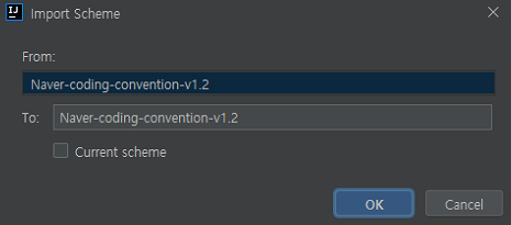 6. 다운로드한 naver-intellij-formatter.xml을 선택한다. To 항목은 스타일의 식별자로, 여러 프로젝트에서 참조되는 이름이다. OK버튼을 누르면 설정이 완료된다.