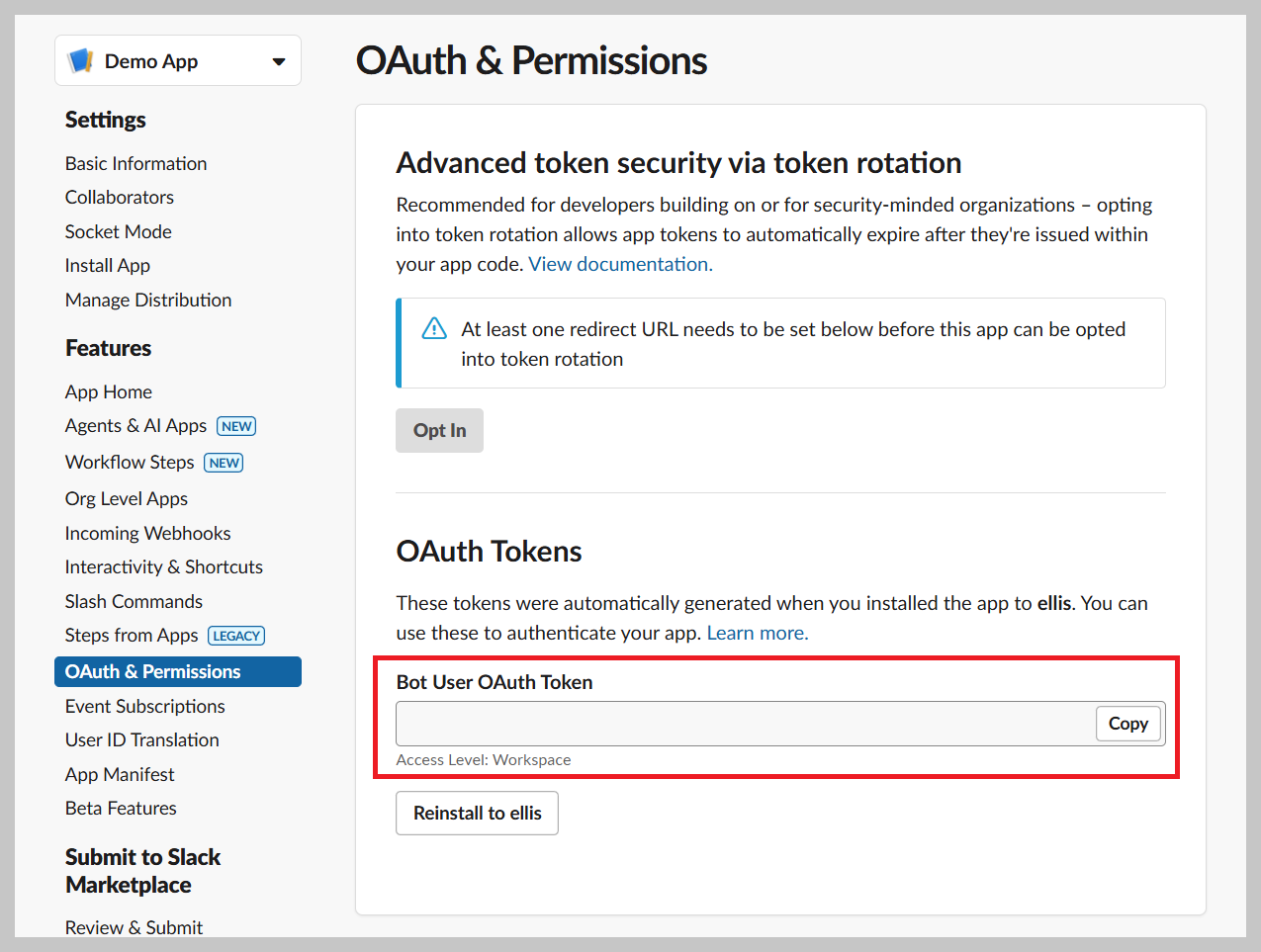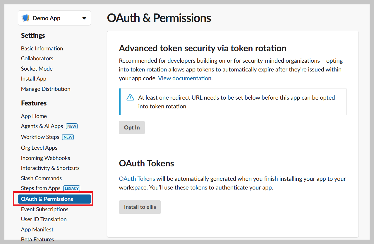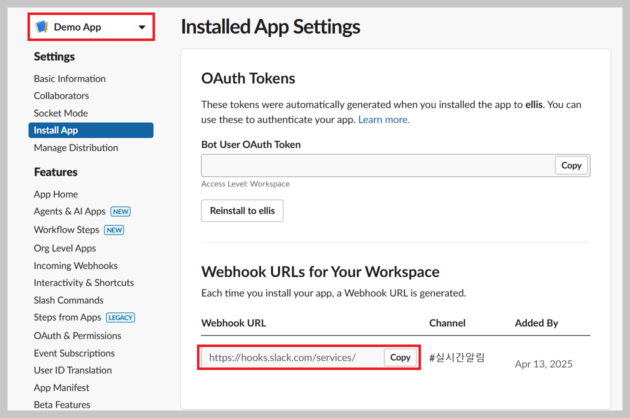 Features ▶ OAuth & Permissions ▶ OAuth Tokens ▶Install to {work space name}